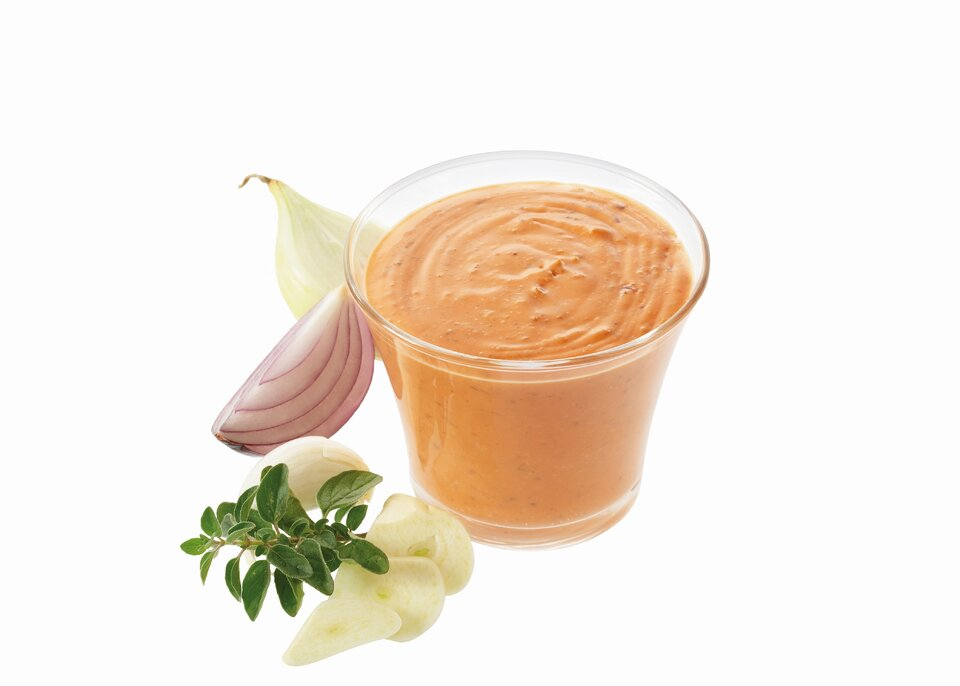 Marinade crémeuse aux reflets jaune-rosé, relevée d’un savoureux mélange de fromage, d’origan et d’oignons.